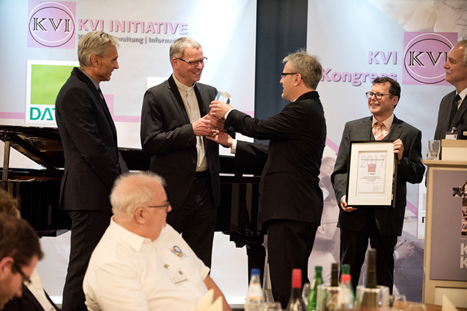 Erster Sieger des KVI Innovationspreises 2017 ist das Bistum Trier mit dem Projekt 'Standardisierung und Vereinfachung der Pfarrverwaltungen'. Generalvikar Dr. Ulrich Graf von Plettenberg wurde von Frank Billet von DATEV eG ein von einer heimischen Glasmanufaktur angefertigter KVI Innovationspreis 2017 Kristallglasaward übergeben, der von der Firma DATEV eG gestiftet wurde. Dem Projektleiter und kirchlichen Notar Dr. Ulrich Wierz wurde von Adalbert Bayer als Vorsitzenden des KVI Beirats die Siegerurkunde übergeben.